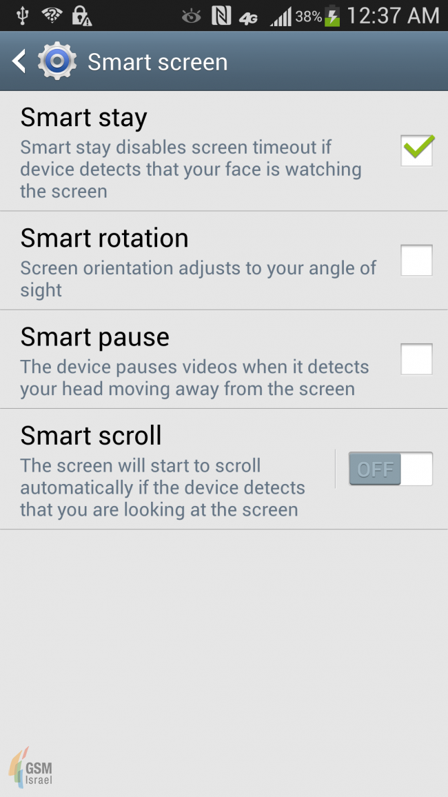 Screenshots from the Galaxy S IV’s American variant have just made an appearance on the internet. This time gsm-israel.co.il posted a couple of screenshots. Screenshots confirm quite a few things, first of all a brand new TouchWiz Nature UX 2.0, a fully revamped settings menu with a tabbed interface and white background. The images also confirm that the device will indeed have the much hyped Smart Scroll, Smart Pause, Smart Stay and Smart Rotation features. The screenshots are confirming a 5″ Full HD Display, 13 Megapixel camera and a Quad-Core 1.8GHz CPU with LTE on-board. Keep in mind as this is an American variant there is still hope that the International Galaxy S IV will feature an Exynos Octa CPU.